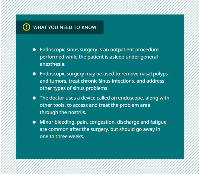 Endoscopic sinus surgery is a procedure to remove blockages and treat other problems in the sinuses using an endoscope — a thin, rigid tube with a camera and a light. This type of surgery does not include cutting the skin because it is performed entirely through the nostrils.